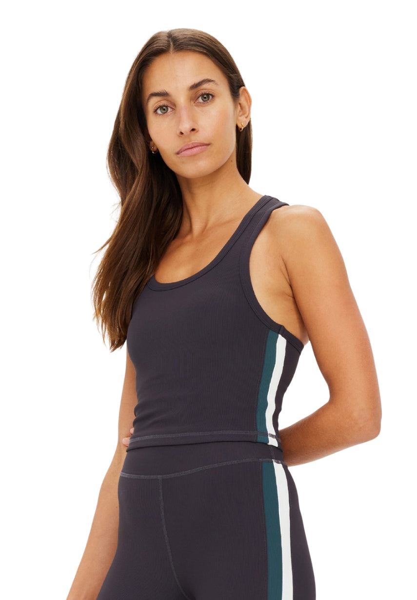 Experience the Limiter Sophie Crop with a stylish racerback design featuring charcoal, cream, and green color blocking. It includes an internal shelf bra with removable cups for customizable support. The back showcases a bold printed arrow logo, while the recycled textured rib fabric keeps you dry with its moisture-wicking capabilities.