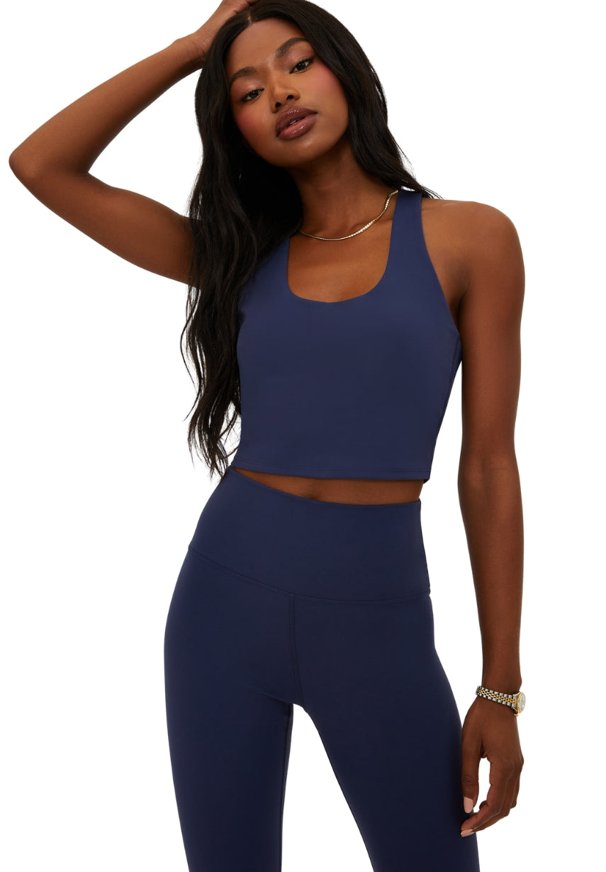 Elevate your workout with the Yara Top. Crafted from ultra-soft, four-way stretch fabric with sweat-wicking properties and medium compression, this crop top offers both comfort and support. With a plunging scoop neckline and a built-in shelf bra, it's the perfect versatile top for any activity. We pair it back to our Solara Legging or Irina Skirt with navy edging.